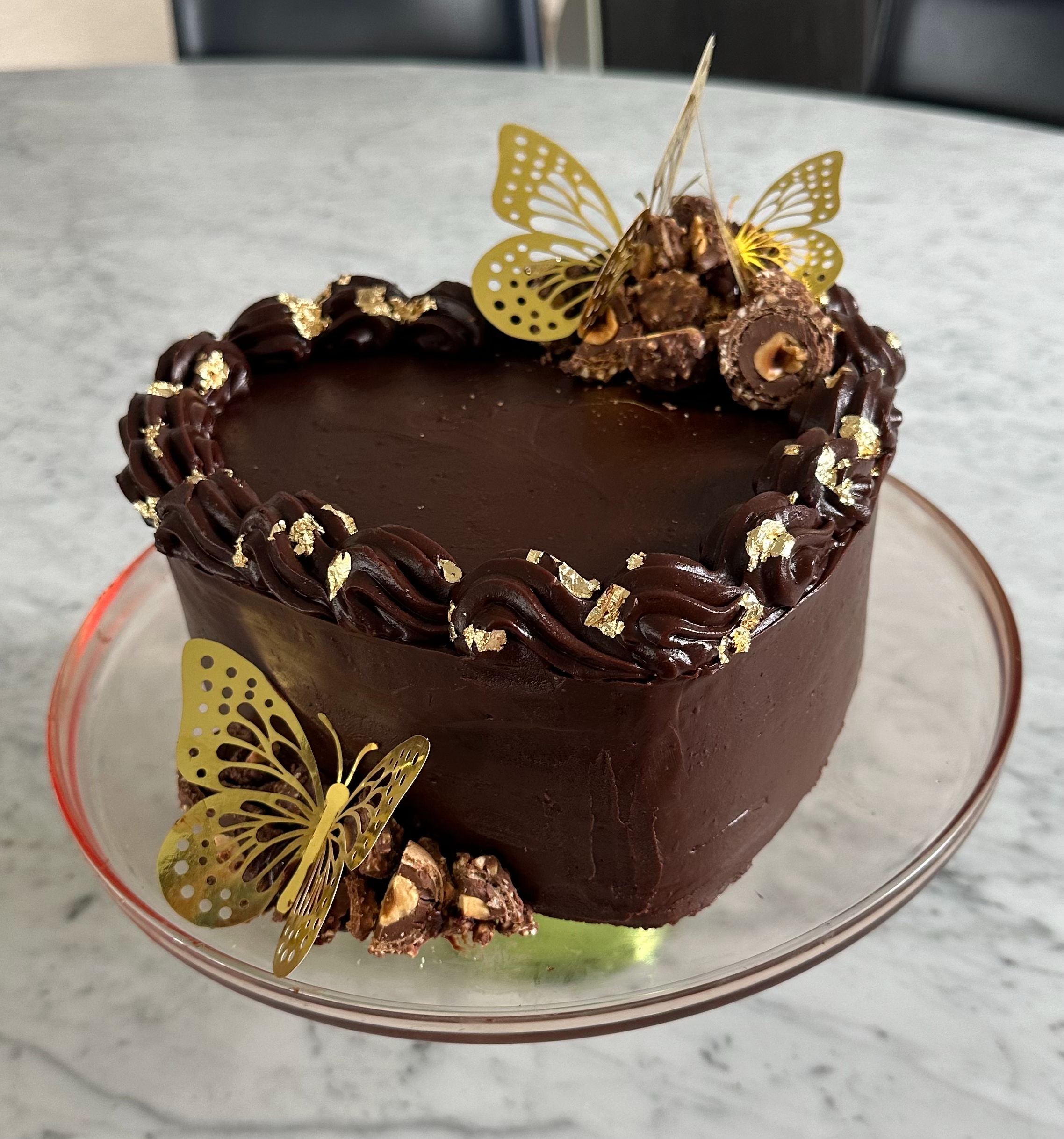A charming red and white heart-shaped cake layered with chocolate sponge and vanilla buttercream, topped with hand-piped rosettes and gold butterflies — a timeless symbol of love and celebration.